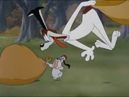 - A dog tries to ensnare Reginald but the fox turns the tables on him. Droopy comes in and asks the fox to get in his sack. Reginald cleverly switches the empty sack with the one that has the dog inside. Droopy sings that he has the fox. When he shows another dog the sack, that dog switches it and heads to the kennel master's home. When the dog sees the bag squirming, he hits it with a shovel. The lump on the dog's head reveals the other dog took the sack with him in it. Since neither the small or big bones are the ones he hit the other dog with, he shows him the shovel he hit him with and gets hit back.