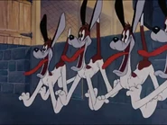 The now injured dogs are limping with casts and bandages. Suddenly, they hear laughter and notice Droopy and the foxes celebrating where they sing "For He's a Jolly Good Fellow" as Droopy shared his steaks with all the foxes he brought with him. As the short ends, Droopy says "You know what? I'm jolly. Pip pip."